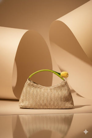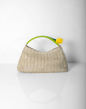 The Magnolia Pouchette captures the quiet beauty of a bloom unfolding. Its relaxed jute body brings a natural, effortless charm, while the curved tulip-like acrylic handle adds a sculptural touch that feels contemporary and refined. This interplay of soft texture and polished form creates a silhouette that is both gentle and striking. Designed for days that call for understated romance, it elevates the everyday with a whisper of artistry.
